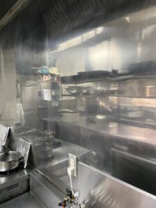 前の棚が映し出されている厨房のガス台の前のステンレス!