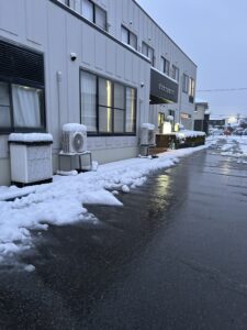 無料駐車場は、融雪ホースで雪を溶かしています、、ご安心ください。